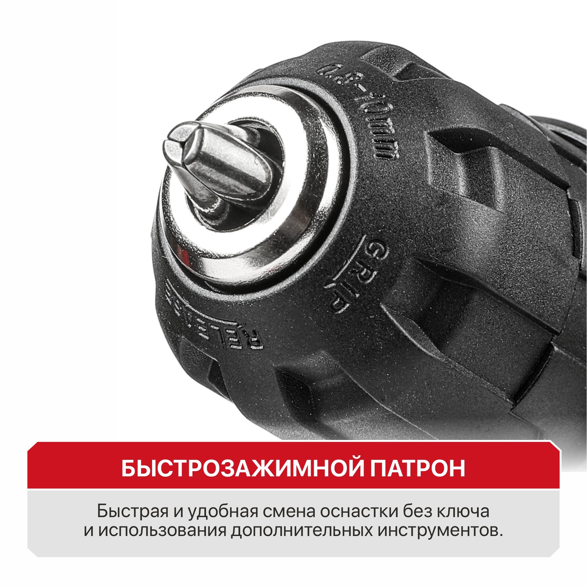 Дрель аккумуляторная, зарядное устройство, аккумулятор (1 шт.), набор бит (10 шт), магнитный адаптер, руководство по эксплуатации, коробка
