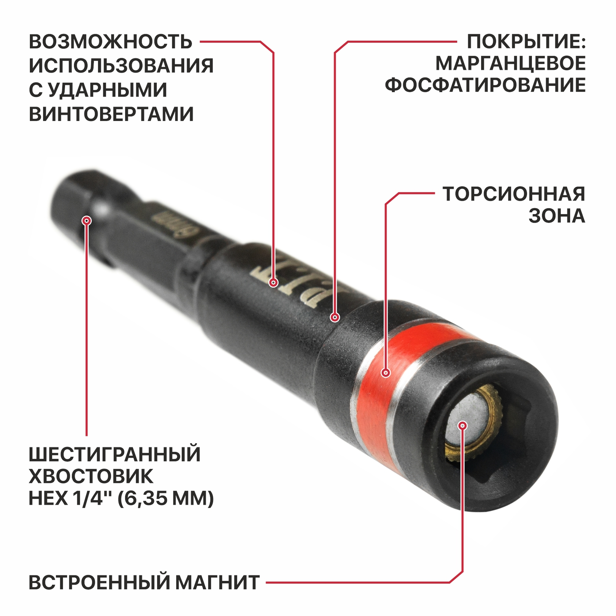 Торсионная зона и шестигранный хвостовик позволяют использовать торцевую головку не только с обычными дрелями и шуруповертами, но и с ударными винтовертами IMPACT.