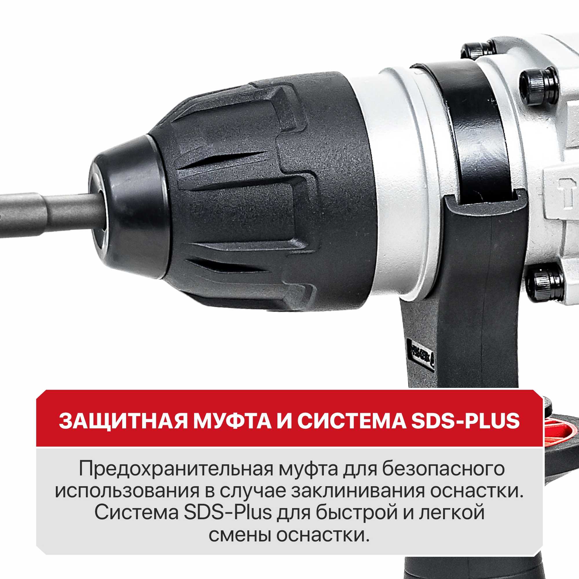 Эргономичная обрезиненная D-образная рукоятка с большим выключателем для комфортной работы и система SDS-Plus для быстрой смены оснастки.