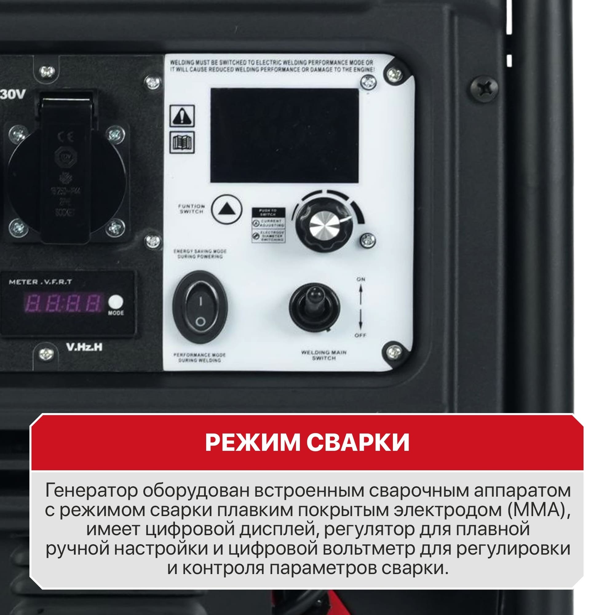 Генератор оборудован встроенным сварочным аппаратом с режимом сварки плавким покрытым электродом (ММА), имеет цифровой дисплей, регулятор для плавной ручной настройки и цифровой вольтметр для регулировки и контроля параметров сварки.