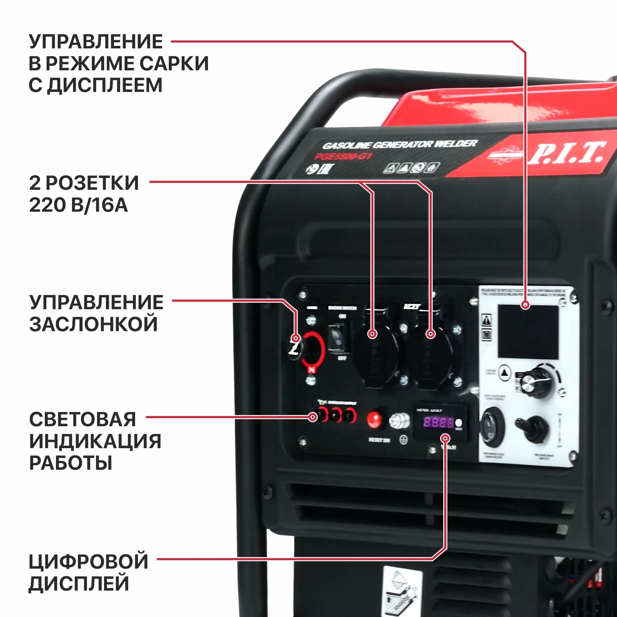 Сварочный инверторный бензиновый генератор PGE5500-G1 - универсальный агрегат, предназначенный для автономного питания однофазных бытовых электроприборов, а также для сварочных работ плавким покрытым электродом (ММА). Может использоваться в быту, на садовых или приусадебных участках, на природе и на строительных площадках.