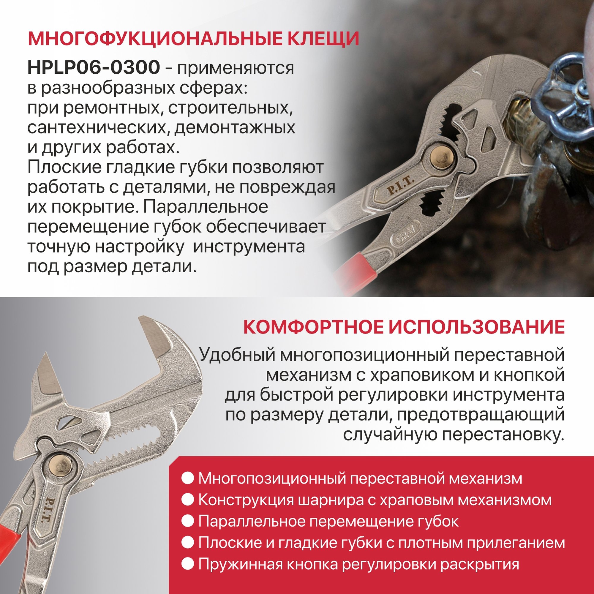 Плоские гладкие губки позволяют работать с деталями, не повреждая их покрытие. Параллельное перемещение губок обеспечивает точную настройку инструмента под размер детали.
