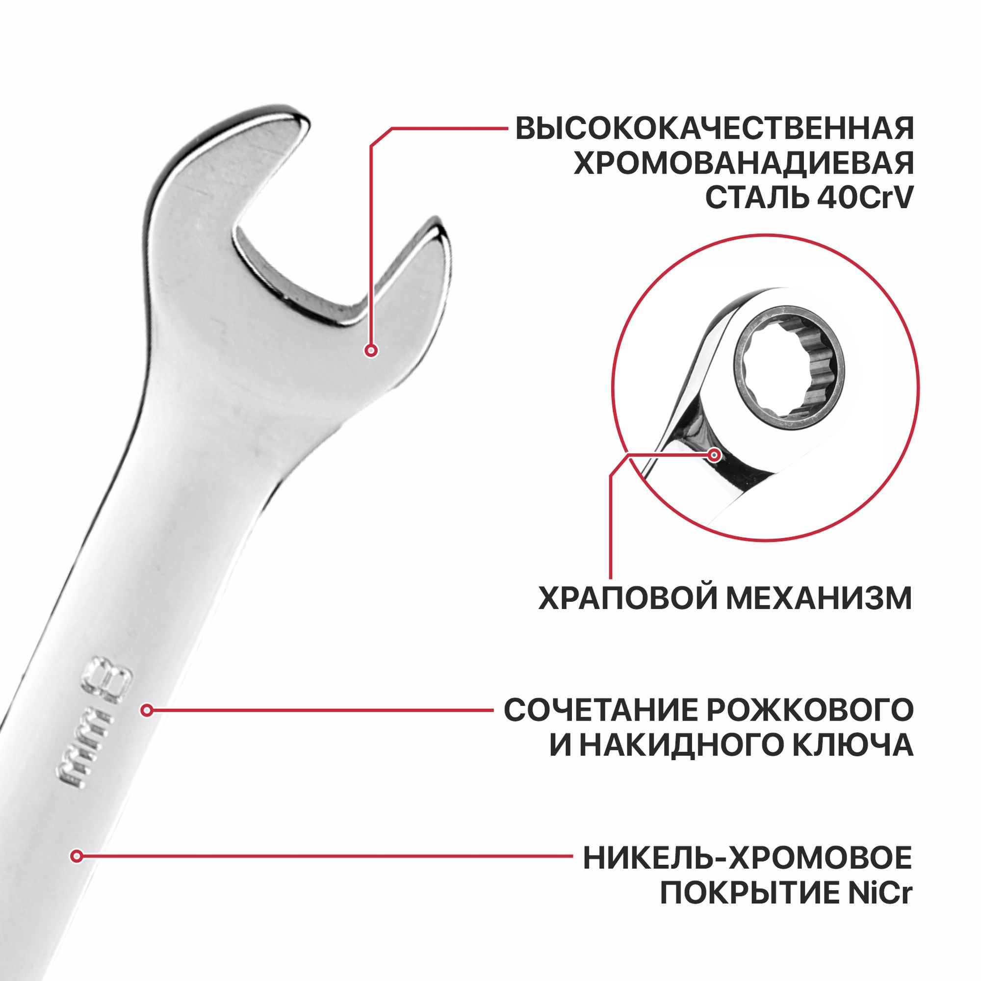 Прецизионный храповик имеет 90 зубцов, и для одного поворота требуется всего 4°. Трещотка изготовлена из прочного хромованадиевого сплава с добавлением бора, что обеспечивает высокую прочность и твердость, больший крутящий момент и длительный срок службы.