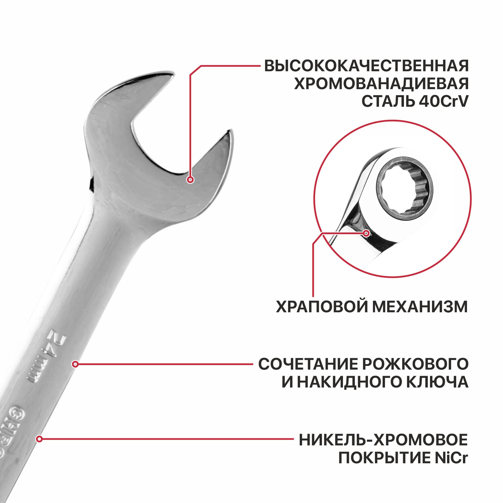 ● Высококачественная хромованадиевая сталь● Сочетание рожкового и накидного ключа