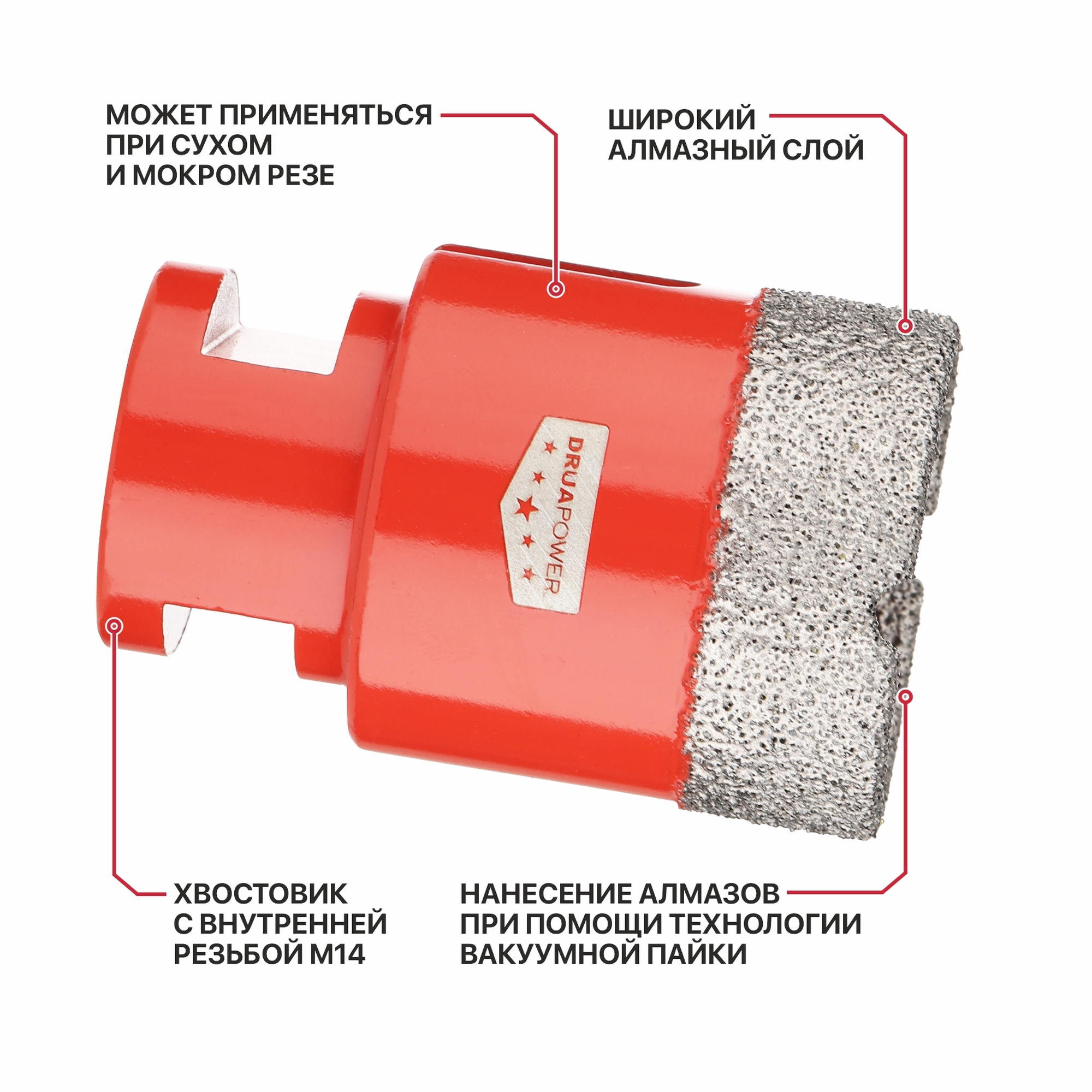 Особенности и Преимущества: - Нанесение алмазов при помощи технологии вакуумной пайки - Широкий алмазный слой - Возможность использования при сухом и мокром сверлении - Хвостовик с внутренней резьбой М14 *фотография носит информационный характер, внешний вид товара и упаковки может отличатьсяКомплектация