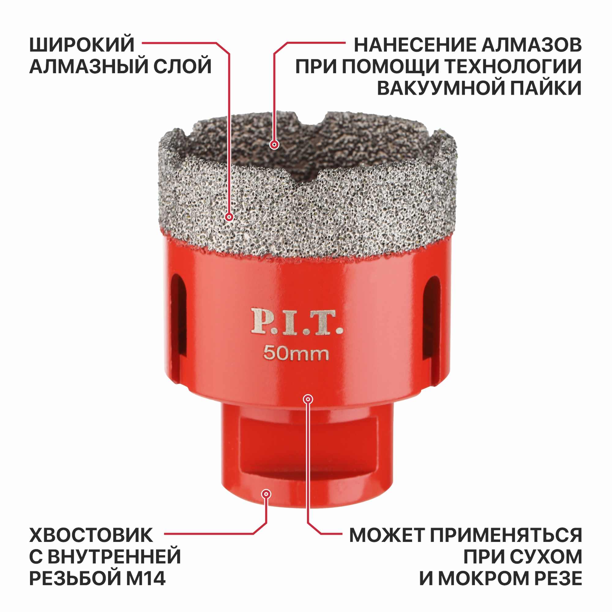Особенности и Преимущества: - Нанесение алмазов при помощи технологии вакуумной пайки - Широкий алмазный слой - Возможность использования при сухом и мокром сверлении - Хвостовик с внутренней резьбой М14 *фотография носит информационный характер, внешний вид товара и упаковки может отличатьсяКомплектация