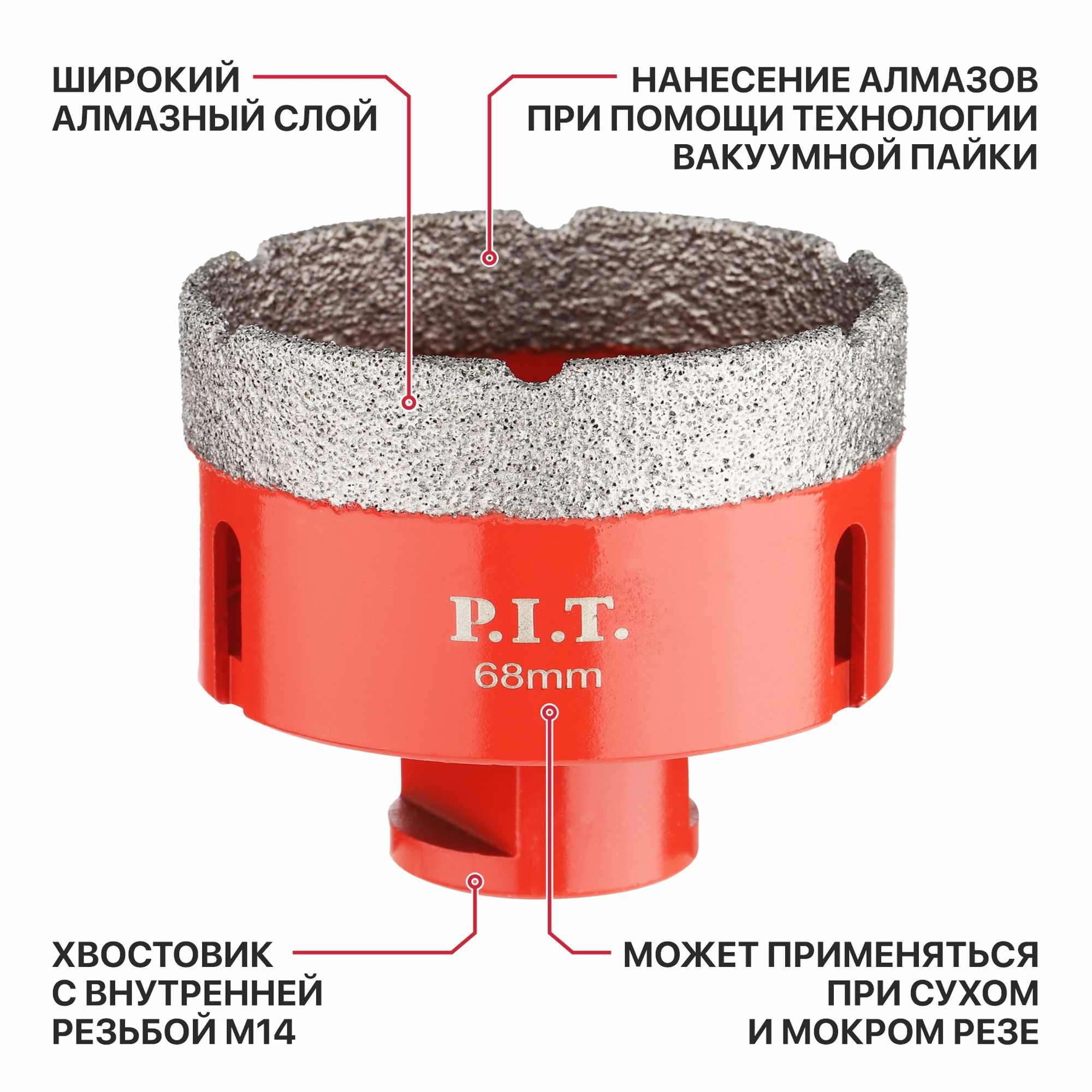 Особенности и Преимущества: - Нанесение алмазов при помощи технологии вакуумной пайки - Широкий алмазный слой - Возможность использования при сухом и мокром сверлении - Хвостовик с внутренней резьбой М14 *фотография носит информационный характер, внешний вид товара и упаковки может отличатьсяКомплектация