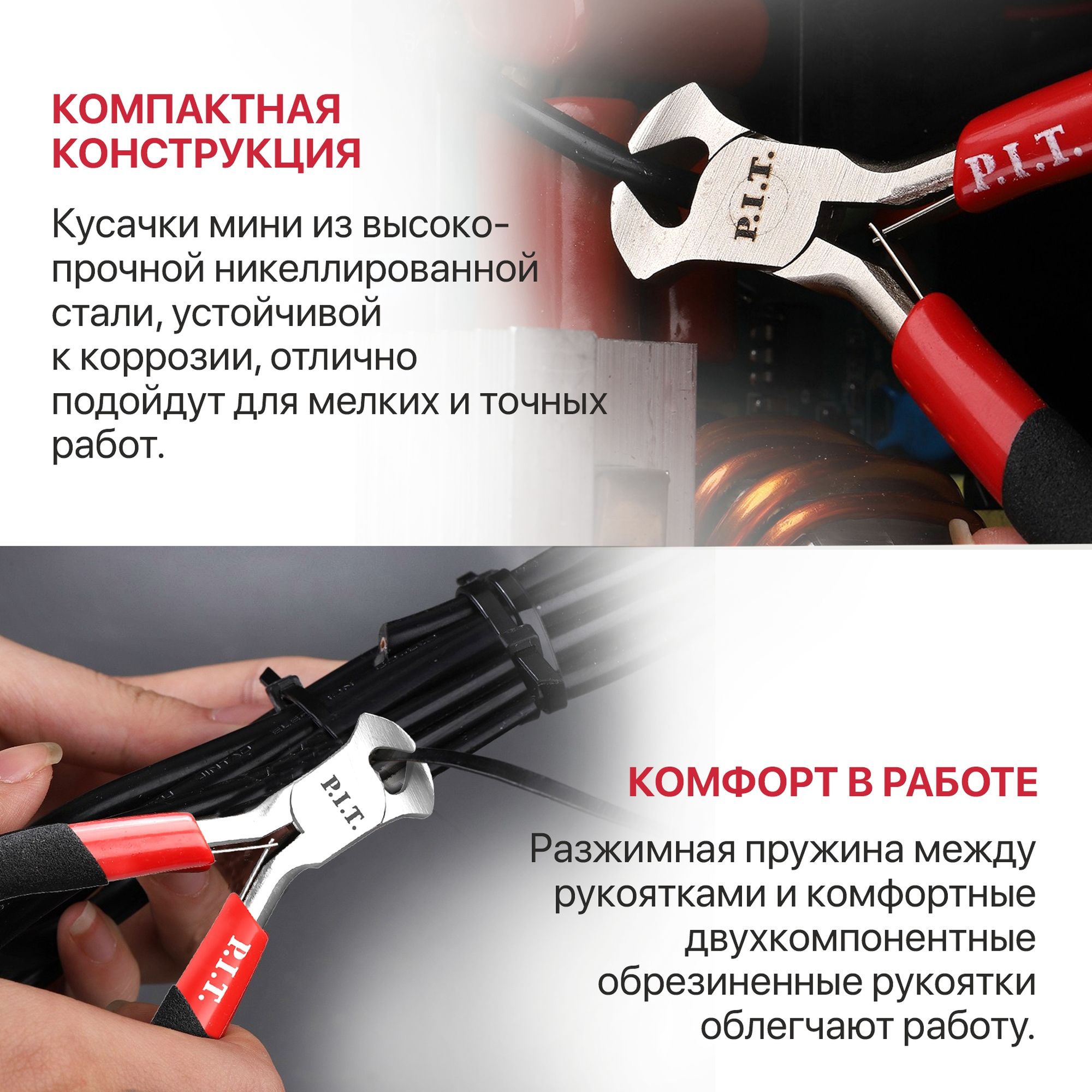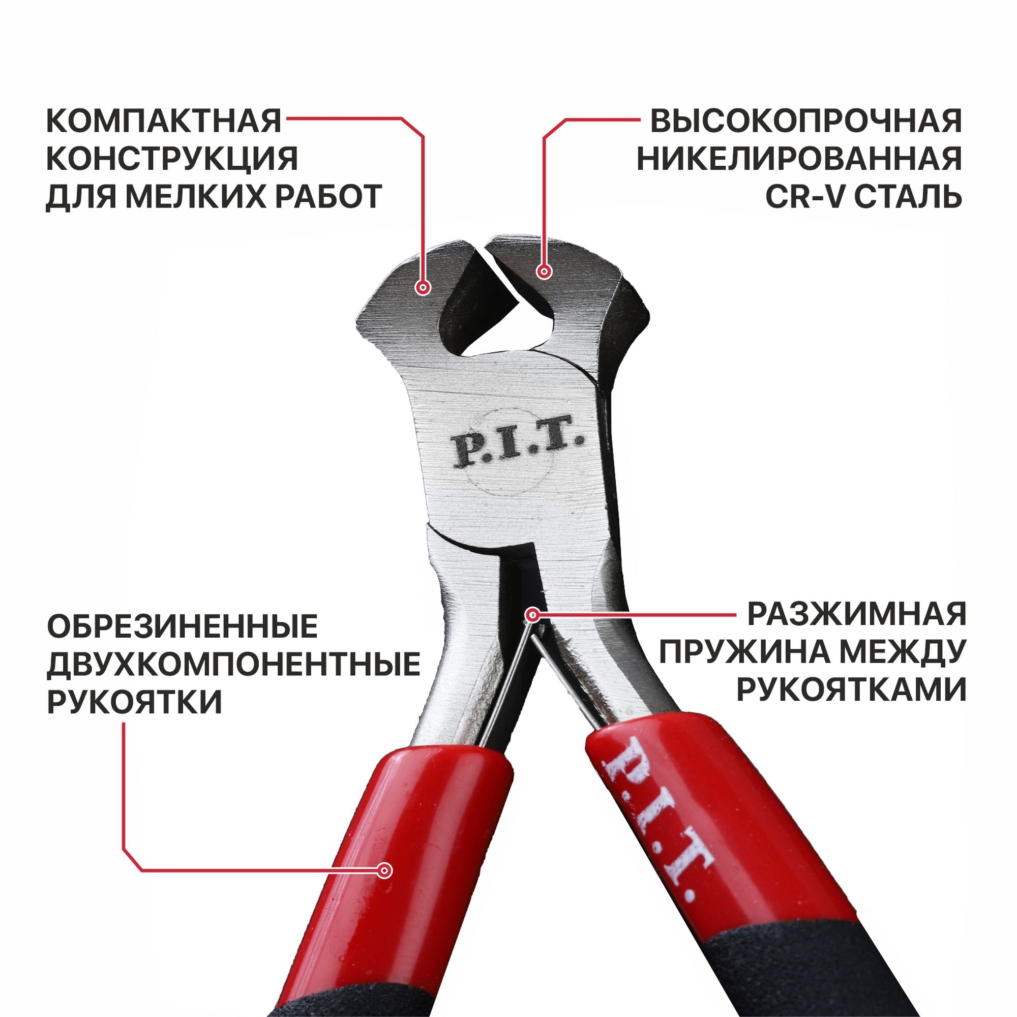 Серия компактных шарнирно-губцевых мини инструментов P.I.T. - идеальный вариант для мелких и точных работ, а также для использования в труднодоступных местах. Хромованадиевые губки имеют никелированное покрытие, которое служит для защиты от коррозии. Двухкомпонентный материал рукояток с обрезиненным покрытием и возвратная пружина обеспечивают комфортное применение.
