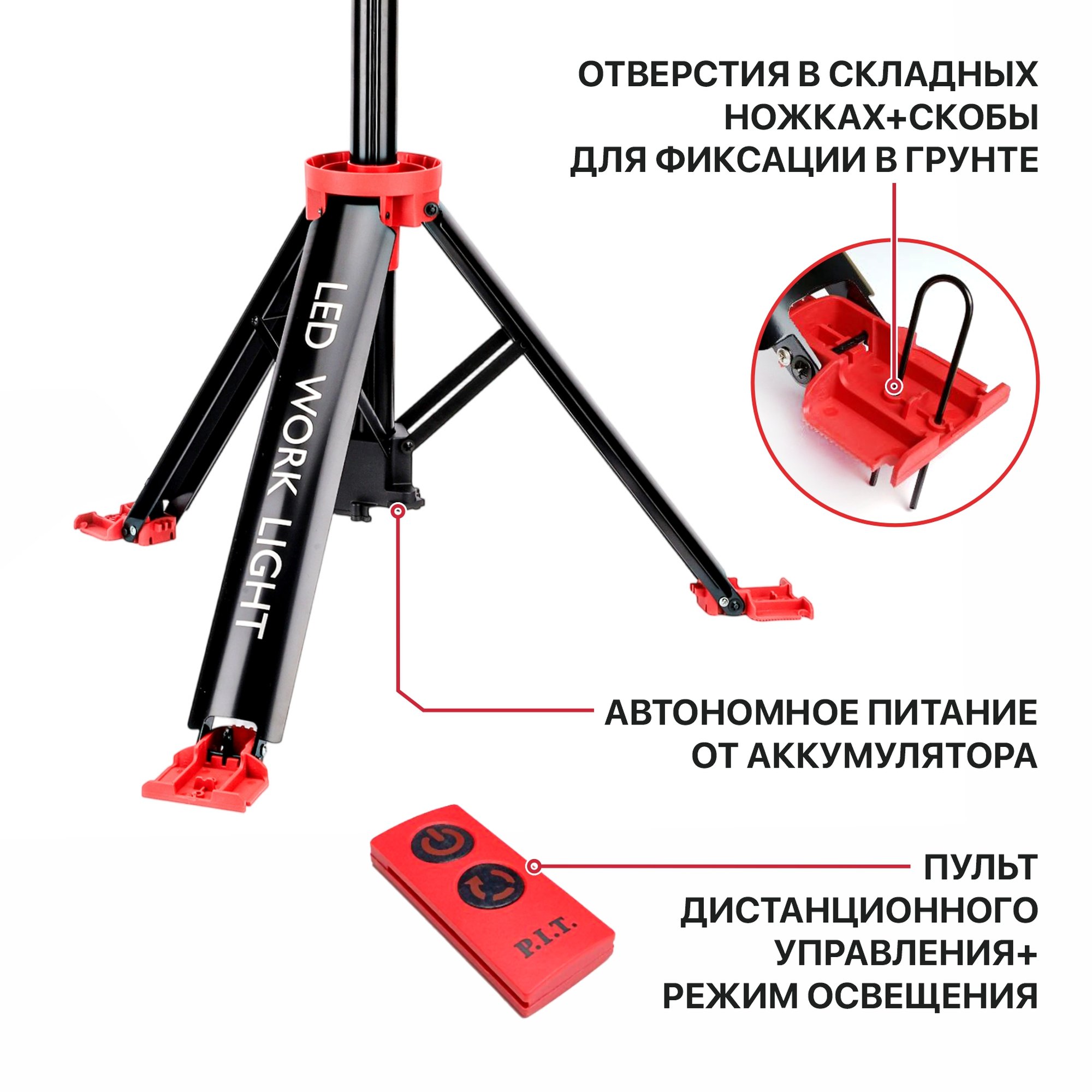 Отверстия в складных ножках и входящие комплект специальные скобы позволяют фиксировать мачту в грунте при использовании на улице.