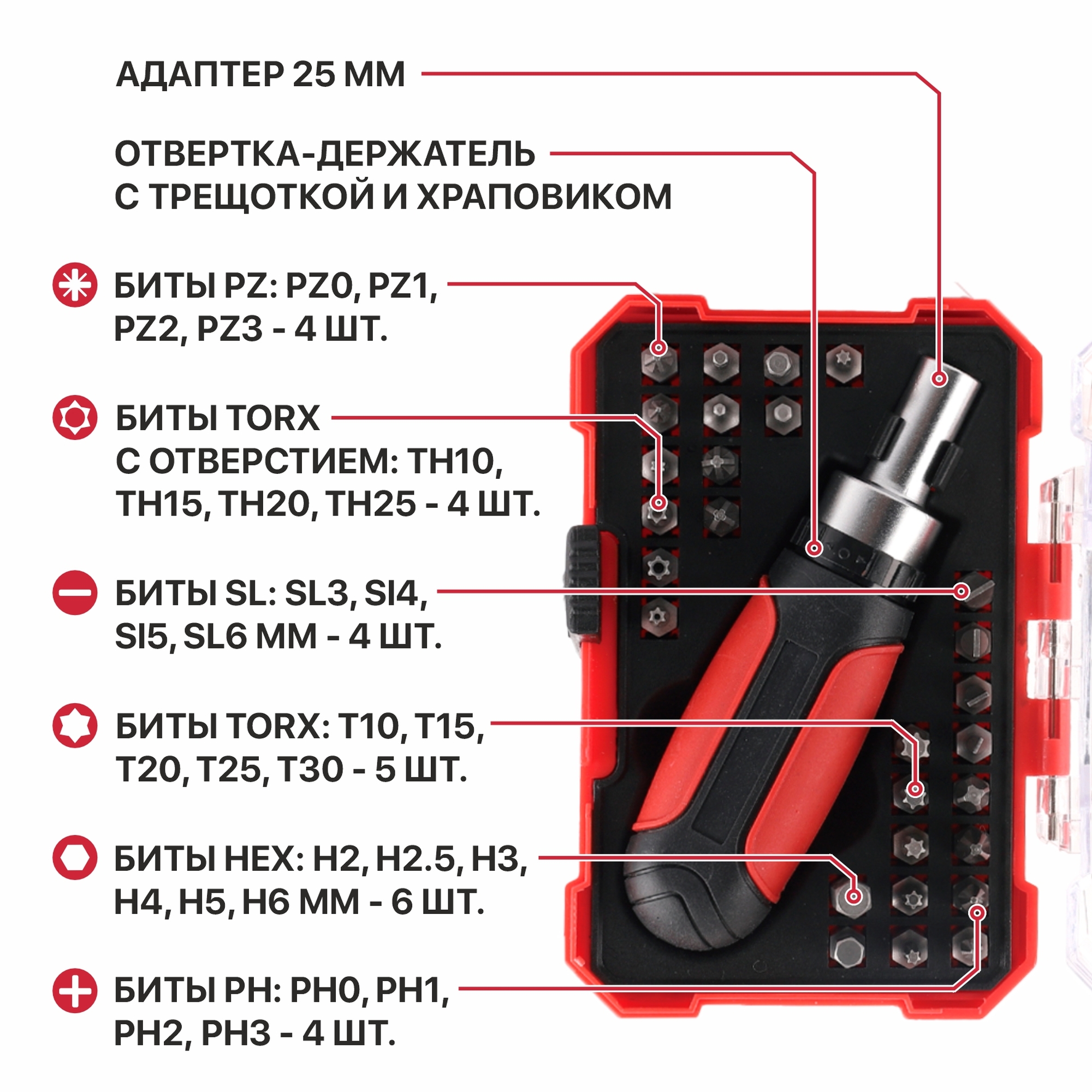 ● Биты TORX: T10, T15, T20, T25, T30 - 5 шт. ● Биты TORX с отверстием: TH10, TH15, TH20, TH25 - 4 шт.