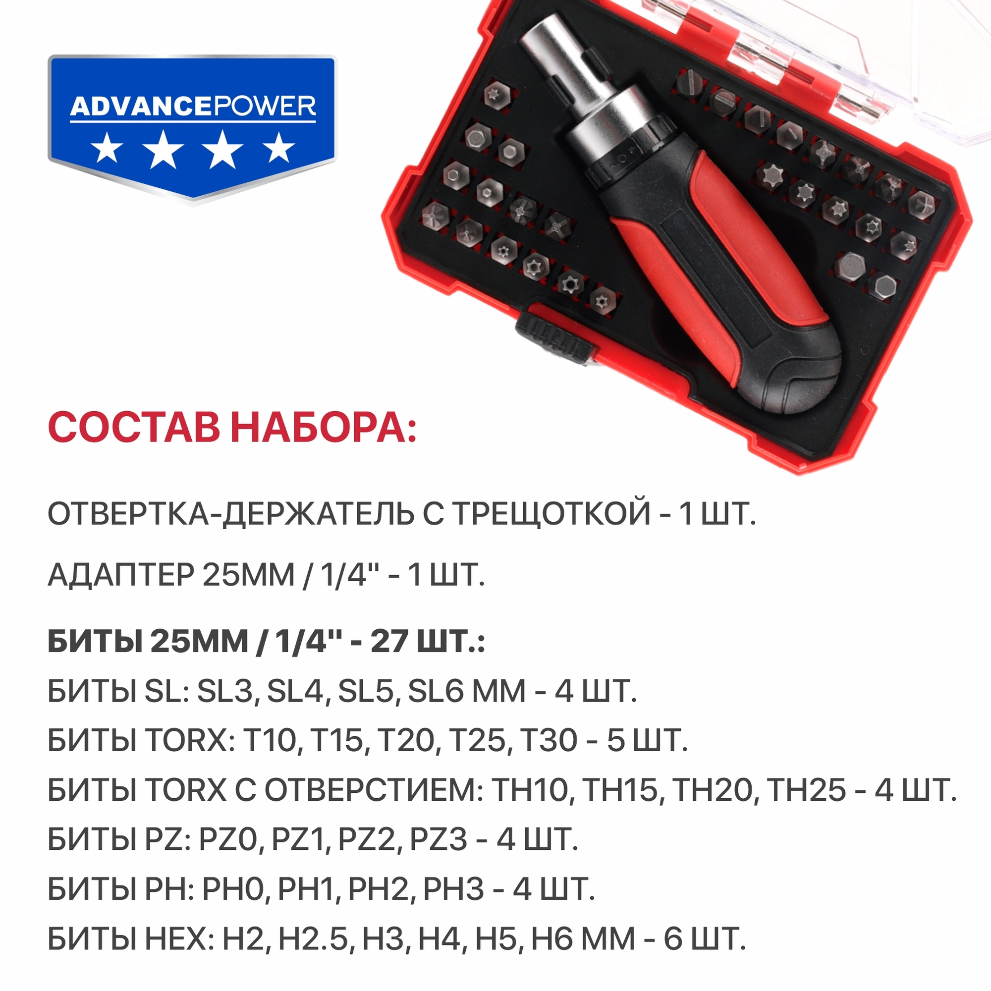 Биты (27 шт.), адаптер, рукоятка-держатель с трещоткой, кейс