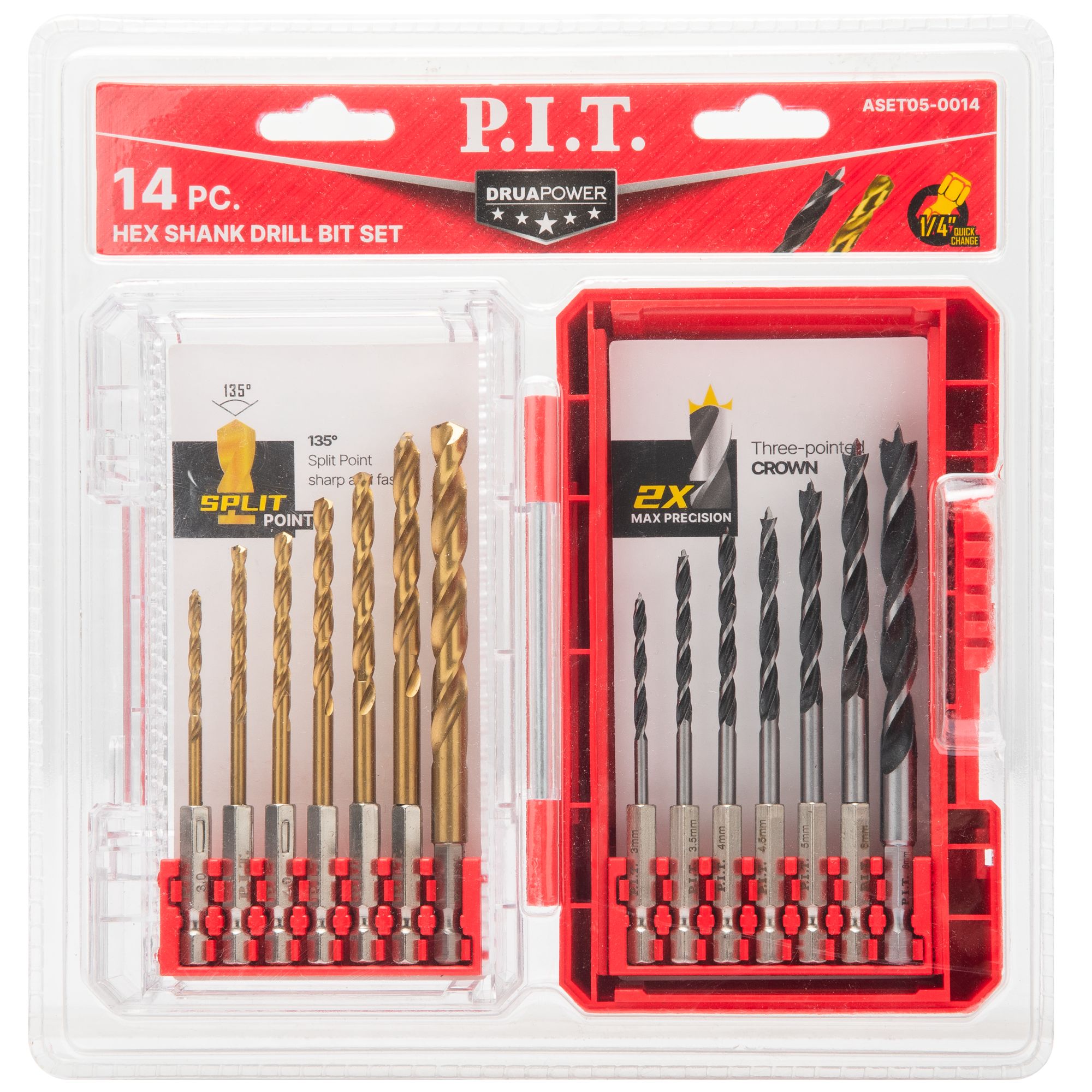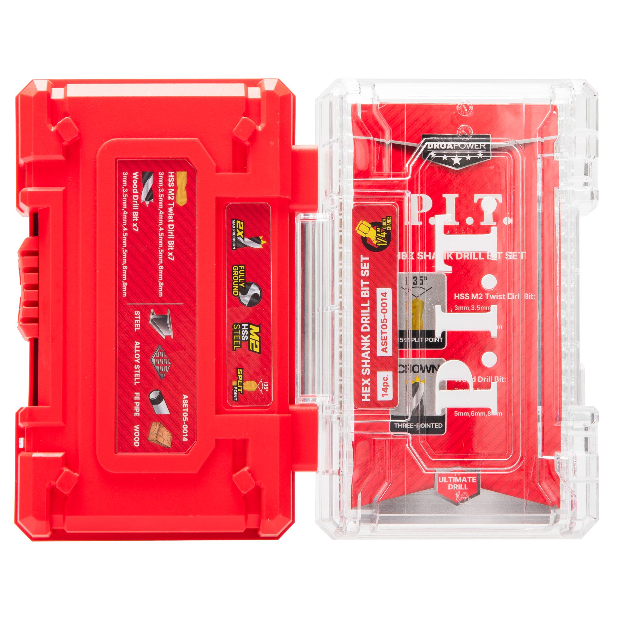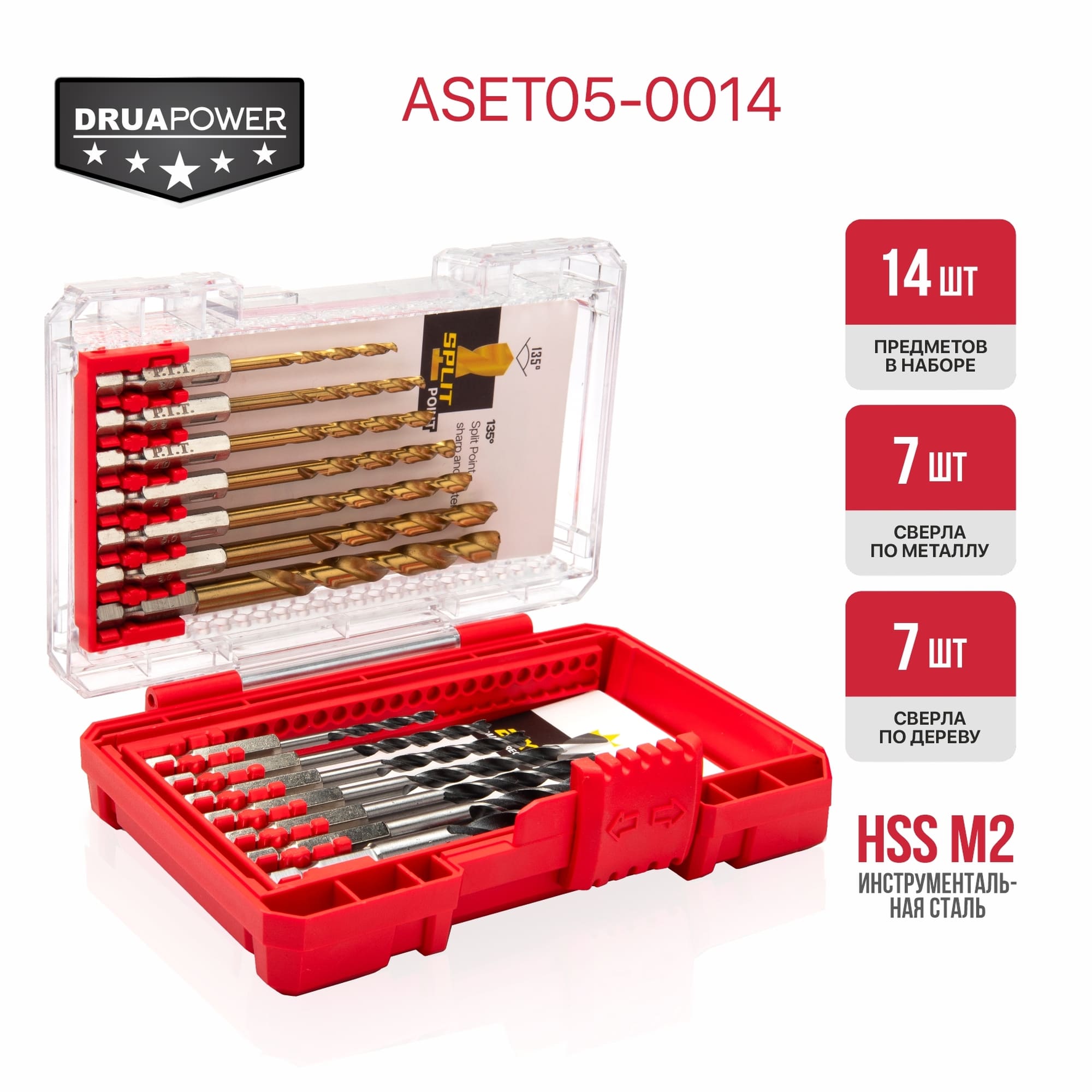Набор свёрл по металлу и дереву ASET05-0014 серии DRUA содержит 14 спиральных сверл (7 по металлу и 7 по дереву) самых востребованных диаметров. Шестигранный хвостовик 1/4"(6,35мм) дает возможность использовать эти сверла с шуруповертами.