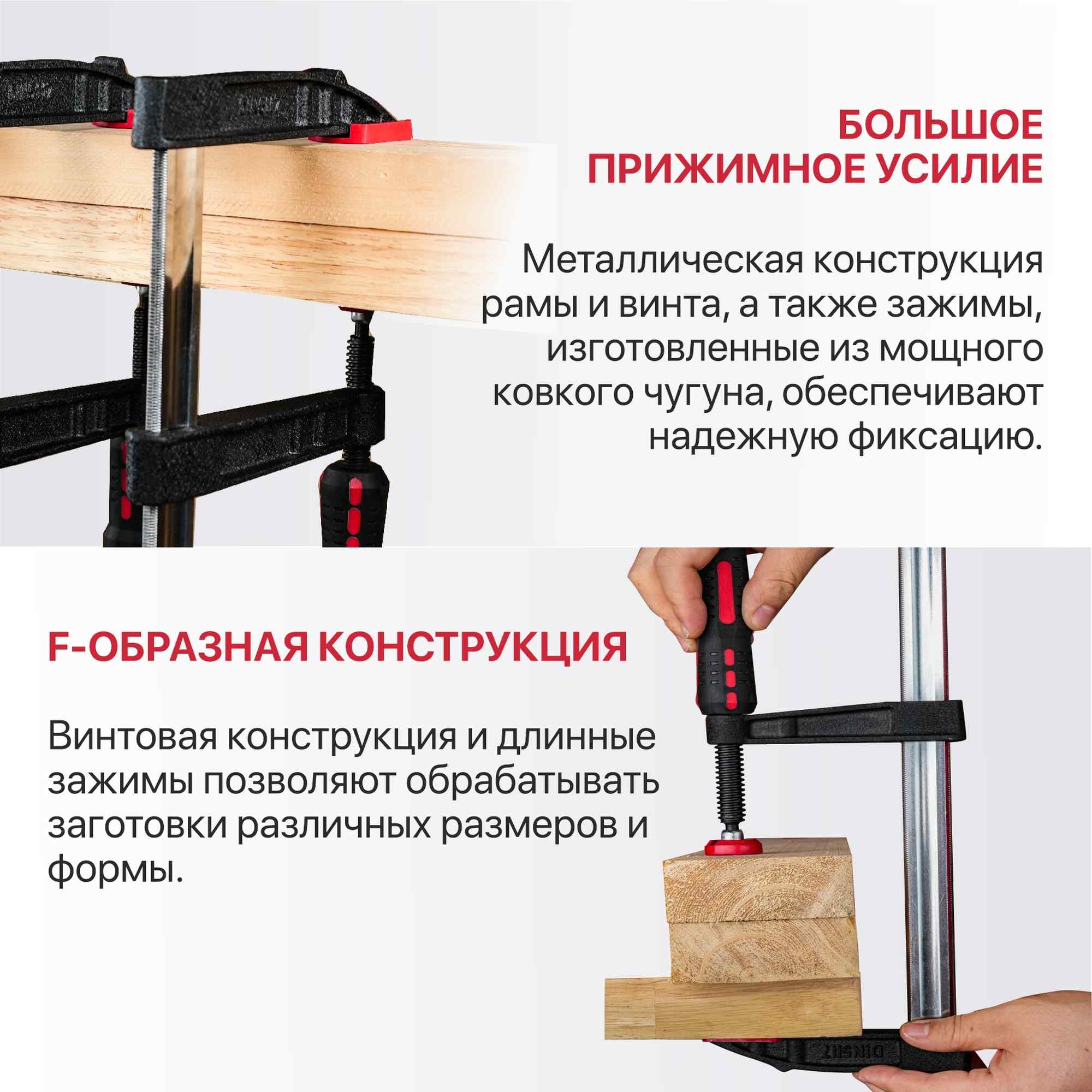 Струбцина винтовая F-образная ручная HCLF03-0800 предназначена для зажима и фиксации заготовок из металла, дерева и других материалов в определённом положении, необходимом для их обработки или склеивания.