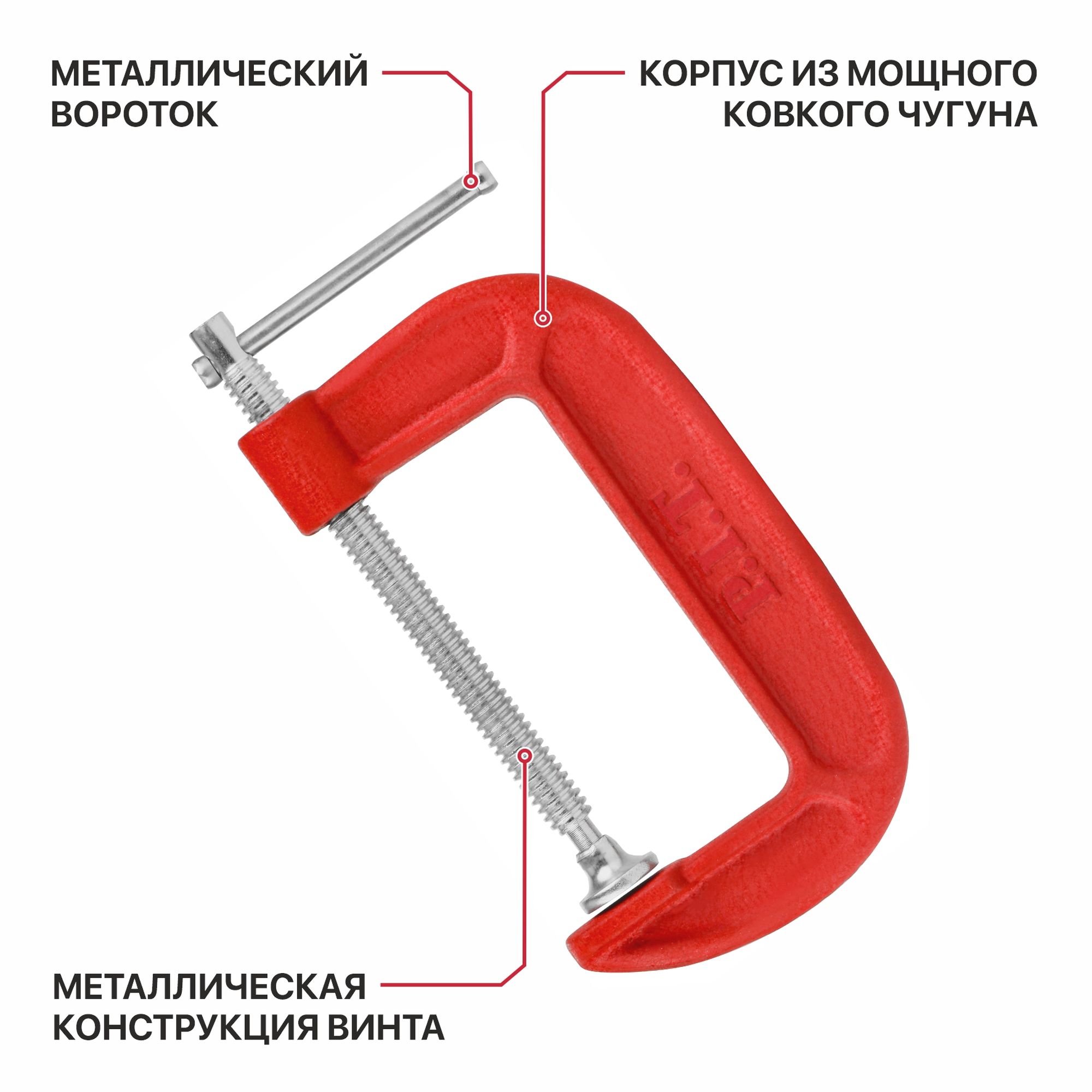 - Винтовая конструкция и G-образный корпус позволяют фиксировать заготовки различных размеров и формы