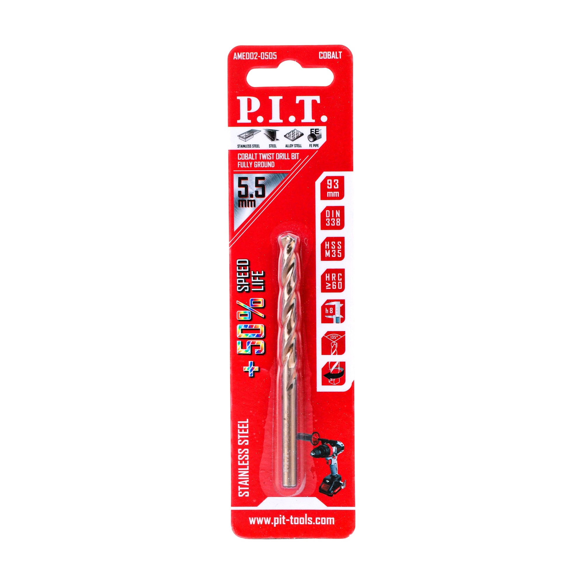 Высокое содержание кобальта 5% и титановое покрытие придают сверлам дополнительную твердость, износостойкость и устойчивость к высоким температурам.