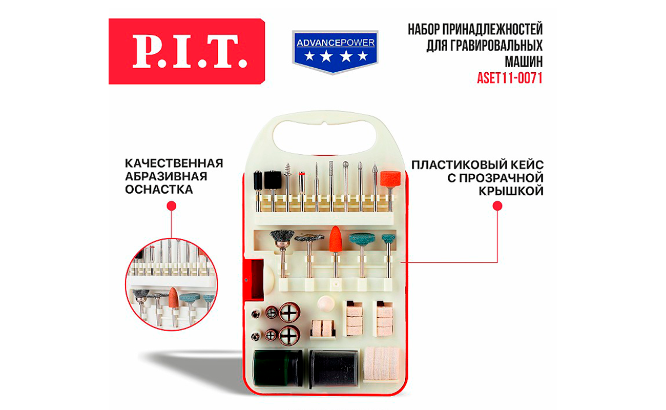 Набор насадок для гравировальных машин ASET11-0071 в пластиковом боксе состоит из 71 предмета.