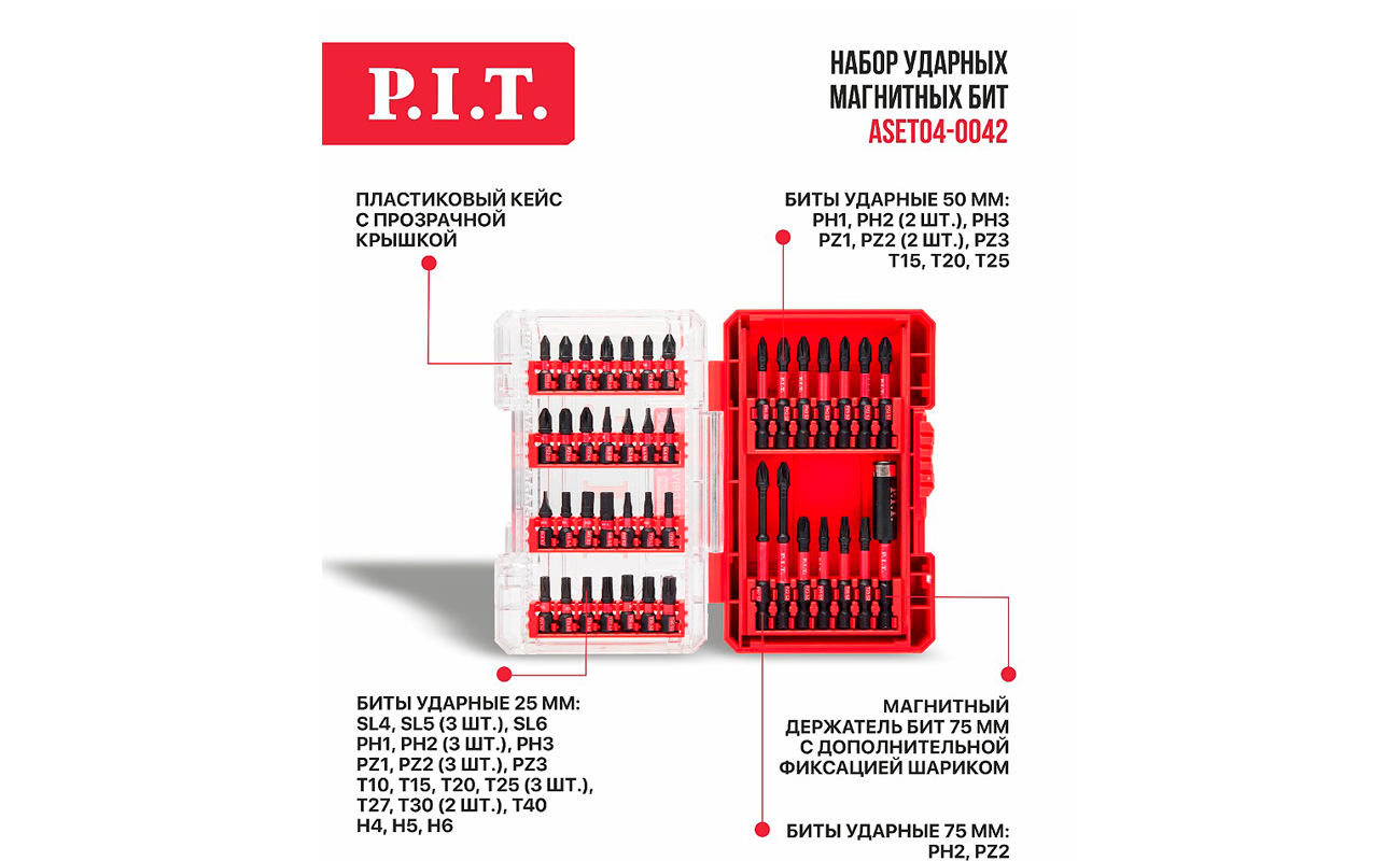 ● Биты ударные 25 мм: SL4, SL5 (3 шт.), SL6, PH1, PH2 (3 шт.), PH3, PZ1, PZ2 (3 шт.), PZ3, T10, T15, T20, T25 (3 шт.), T27, T30 (2 шт.), T40, H4, H5, H6● Биты ударные 50 мм: PH1, PH2 (2 шт.), PH3, PZ1, PZ2 (2 шт.), PZ3, T15, T20, T25