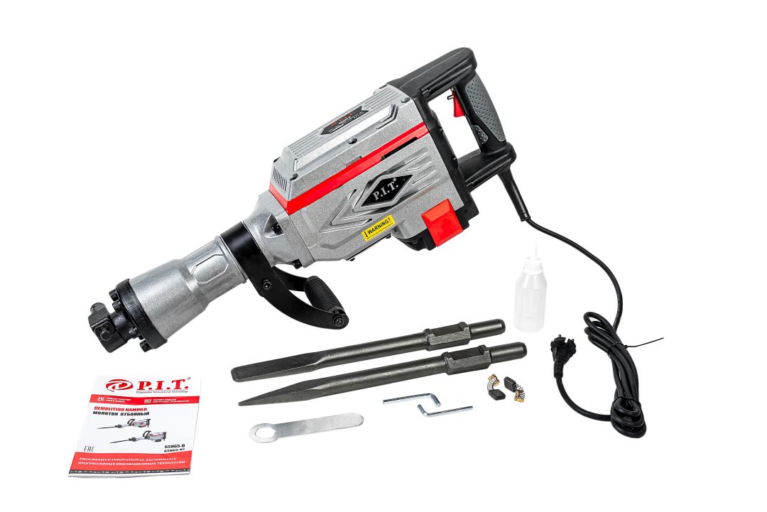 Молоток отбойный, зубило пикообразное, зубило плоское, ключ торцевой, масленка, ключ шестигранный (2шт), металлический чемодан, щетки угольные, руководство по эксплуатации